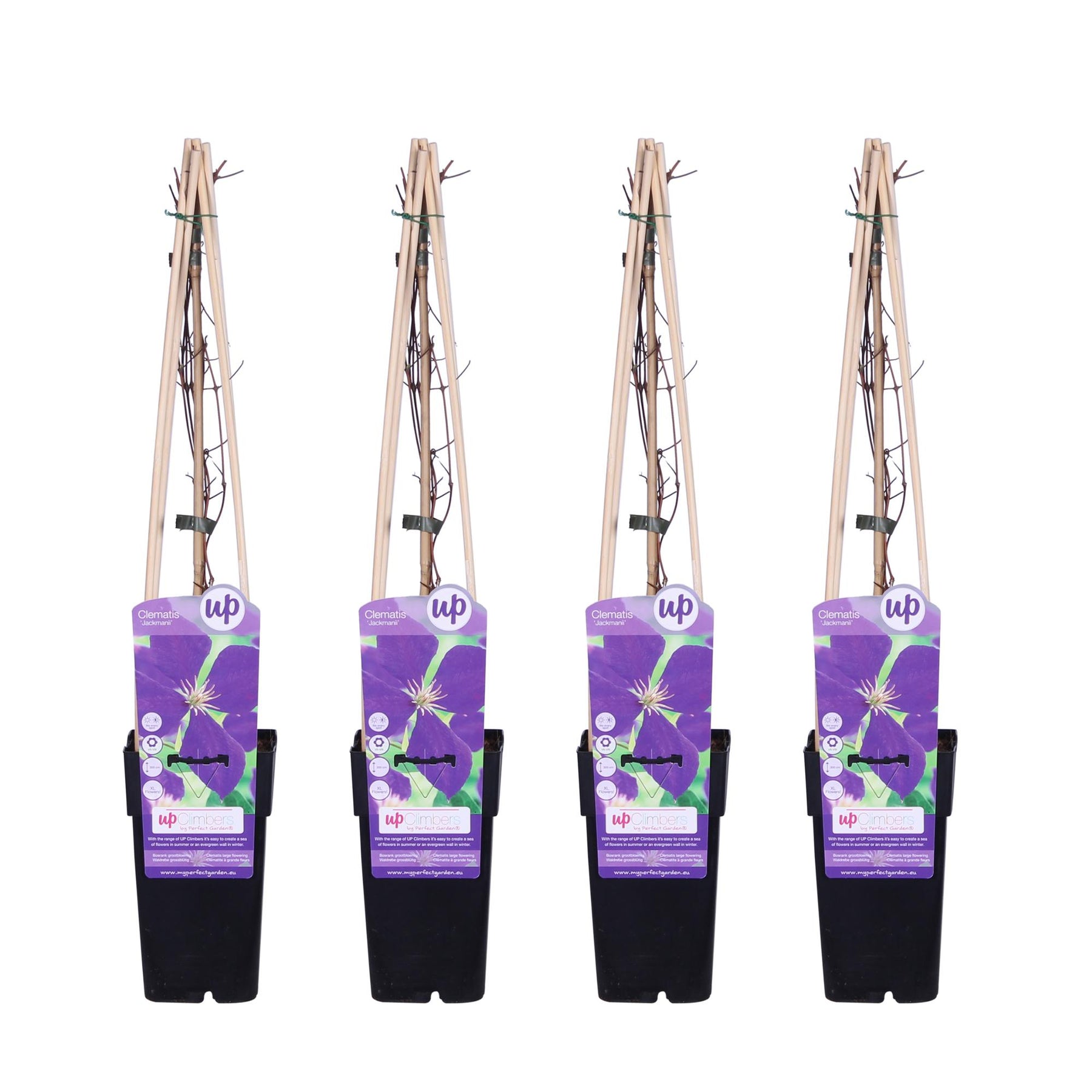 Enhance your garden with the classic beauty of the Clematis 'Jackmanii', one of the most popular and reliable purple clematis varieties in the world. This set of four plants is perfect for creating a dramatic vertical display of color. Known for its medium-sized, velvet-like flowers in a stunning deep purple-blue, 'Jackmanii' is a timeless favorite that brings elegance to any landscape.